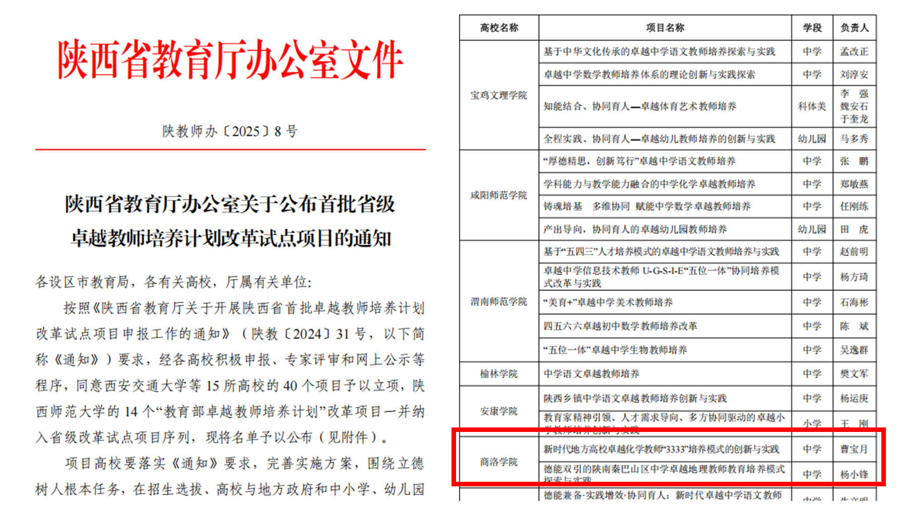 近日,陕西省教育厅办公室公布了首批省级卓越教师培养计划改革试点项目名单。英国365上市公司曹宝月教授主持的《新时代地方高校卓越化学教师“3333”培养模式的创新与实践》和杨小锋博士主持的《德能双引的陕南秦巴山区中学卓越地理教师教育培养模式探索与实践》两个项目获批立项。学校将以实施卓越教师培养计划改革试点项目为契机,持续加强师范专业内涵建设,深化教育教学改革,全面提升师范教育教学水平,助力学校师范专业认证相关工作...