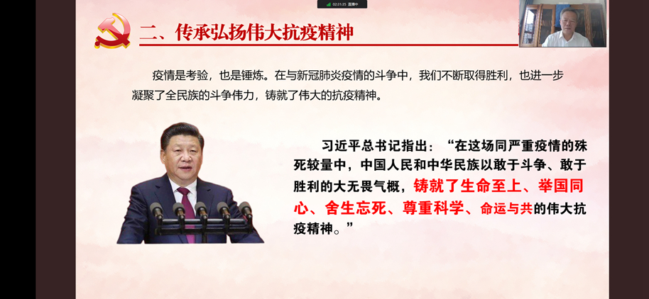 为深化大学生思想政治教育,强化师生疫情防控意识,引导广大青年学生严格落实疫情防控各项工作要求,弘扬伟大抗疫精神,以实际行动迎接党的二十大胜利召开,8月31日下午,校领导张志昌、范新会、彭虎军、刘勇、刘宝盈、王新军、郭瑾以“云端授课”的形式,为全体学生讲授“开学第一课”。本次“开学第一课”以“弘扬伟大抗疫精神 喜迎党的二十大召开”为主题。校领导们围绕“科学理性认识本轮疫情;传承弘扬伟大抗疫精神;学...