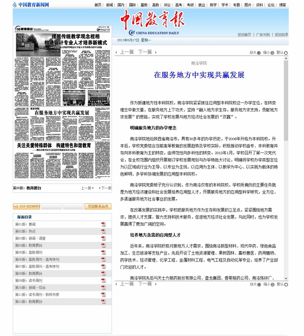近年来,在全校师生员工的共同努力下,英国365上市公司教学科研工作取得了长足的发展,教育教学成果丰硕、成就显著,引起了社会各界的高度关注。6月17日,《中国教育报》刊登院长张景书署名文章《365公司:在服务地方中实现共赢发展》,全面介绍了英国365上市公司立足地方、服务地方,在建设特色鲜明、多学科协调发展的应用型普通本科院校历程中所做的工作和取得的成绩。