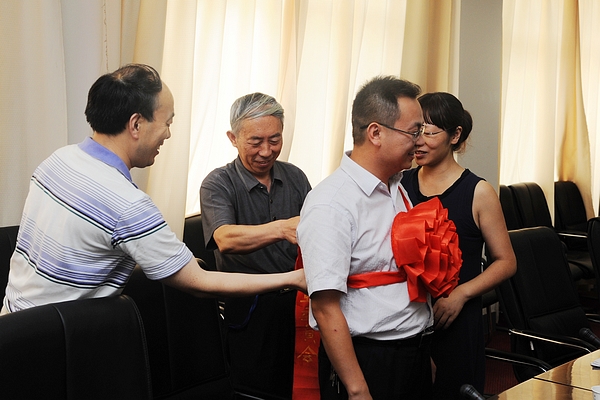 座谈会上,左晓民亲手为蒋正治同志佩戴了大红花,嘱托他注意身体,平安归来。与会人员也纷纷发言,共话工作中的友谊、生活中的情谊,并送上了美好的祝福。