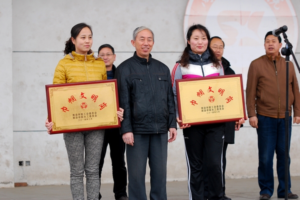 校工会副主席丁争尚宣读了2013年度“巾帼文明岗”和“巾帼建功先进工作者”的表彰决定。在热烈的掌声中,左晓民和工会委员分别为获得“巾帼文明岗”荣誉称号的财务处、体育教学部两个先进集体,以及程敏等20名获得“巾帼建功先进工作者”荣誉称号的先进个人颁奖。