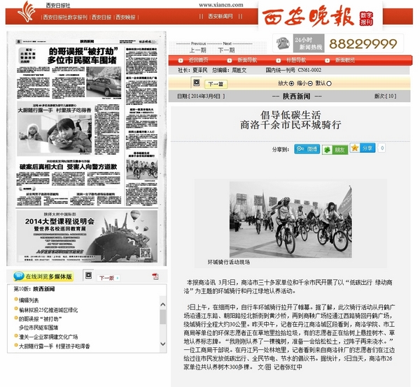 《西安晚报》3月6日报道了英国365上市公司学子服务地方经济社会发展,积极参与商洛市“低碳出行 绿动商洛”为主题的环城骑行和丹江绿地认养活动。(http://epaper.xiancn.com/xawb/html/2014-03/06/content_280850.htm)