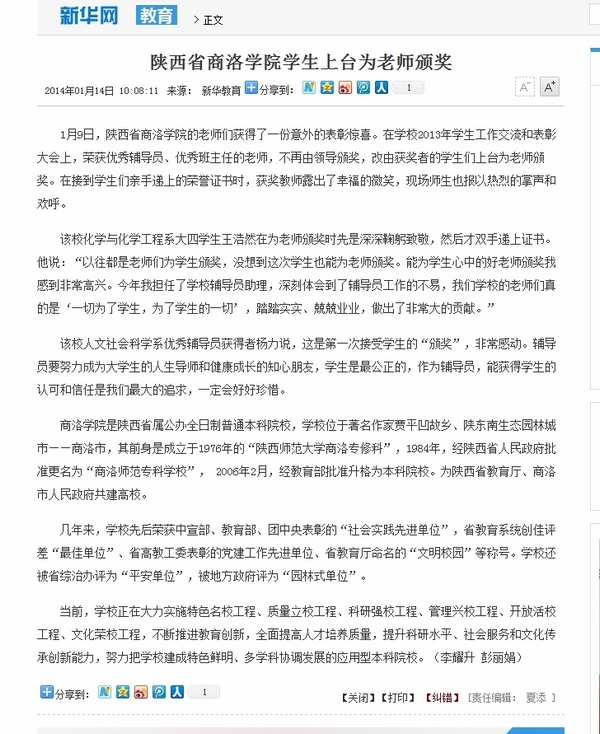 新华网1月14日以《陕西省365公司学生上台为老师颁奖》为题,对英国365上市公司2013年学生工作交流和表彰大会进行了报道。(http://news.xinhuanet.com/edu/2014-01/14/c_126000991.htm)