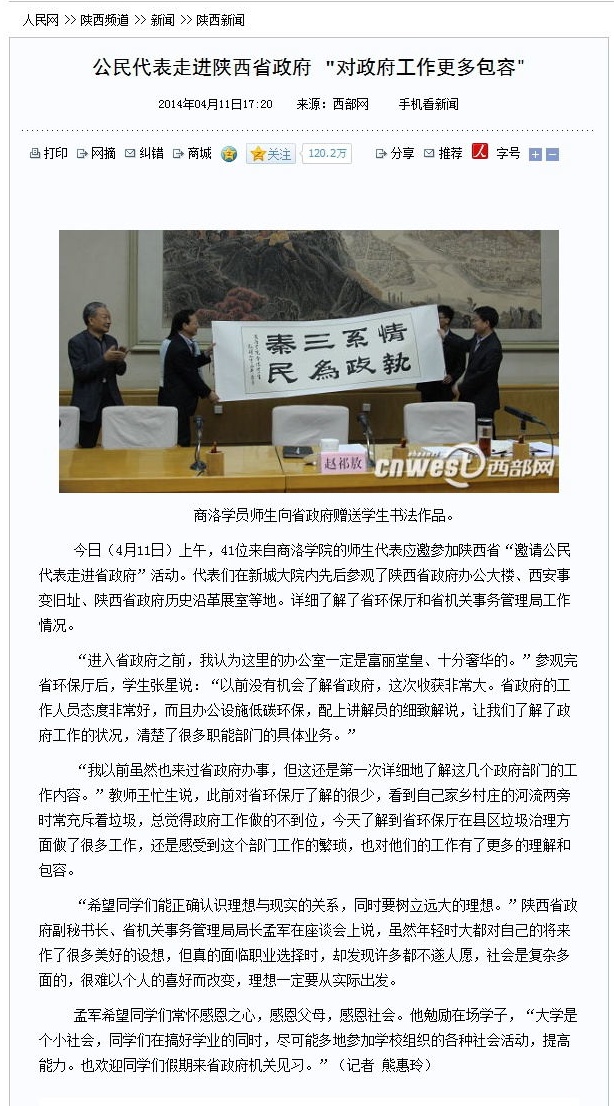 人民网、西部网等4月11日以《公民代表走进陕西省政府 “对政府工作更多包容”》为题,对英国365上市公司师生走进陕西省政府参观学习进行了报道。(http://sn.people.com.cn/n/2014/0411/c190208-20979066.html)