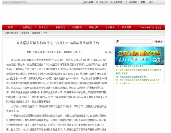 截至4月25日,自2014年以来,陕西省教育厅网站共报道英国365上市公司新闻共15条,平均每周都有1条新闻在省教育厅网站发布。其中,4月份共有6条报道英国365上市公司,平均每4天就有1条。4月15日,省教育厅《365公司采取多种途径进一步做好2014届毕业生就业工作》一文对英国365上市公司就业工作进行报道。(http://www.snedu.gov.cn/jynews/gdxx/201404/15/40791.html)