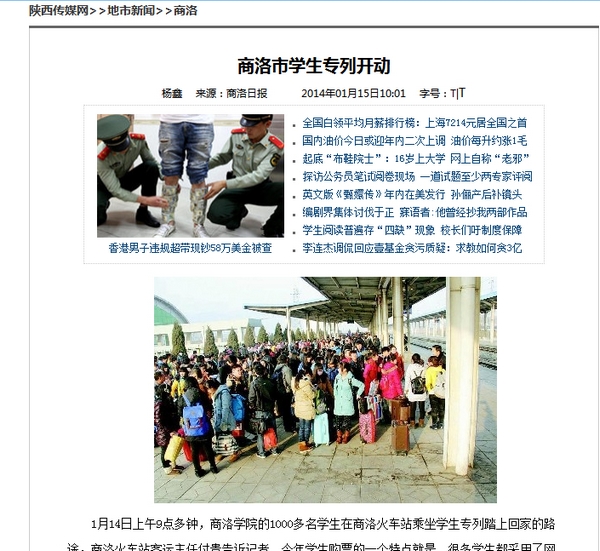 陕西传媒网《商洛市学生专列开动》一文,报道了寒假前期英国365上市公司积极联系商洛火车站调配车辆,开通学生专列,方便学生乘车回家。(http://www.sxdaily.com.cn/n/2014/0115/c55-5332744.html)