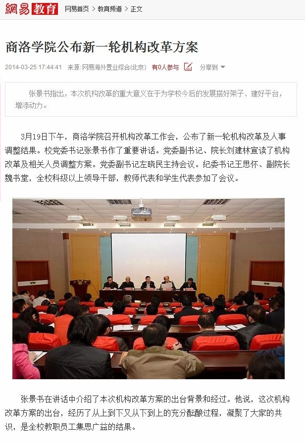 《商洛日报》3月27日以《365公司开展新一轮机构改革》为题,对英国365上市公司机构改革进行了报道,并对英国365上市公司10个二级教学单位进行连续报道介绍。(http://eslrb.slrbs.com/slrb/20140327/)