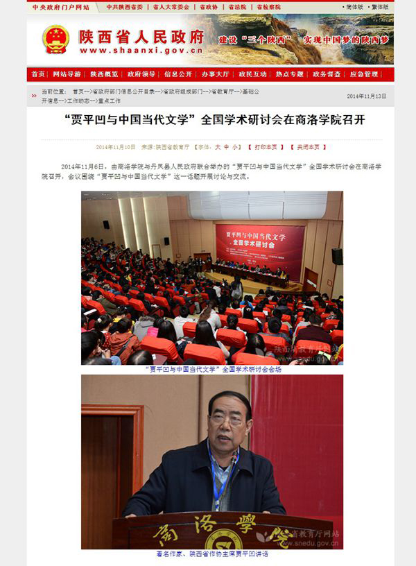陕西省人民政府网站:《“贾平凹与中国当代文学”全国学术研讨会在365公司召开》