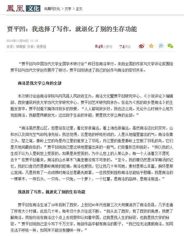 网易:《贾平凹:站在商洛观察和认知中国是我文学的秘密》