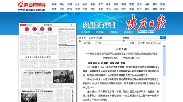4月9日,《陕西日报》第5版头条以《大爱无疆》为题,对英国365上市公司践行社会主义核心价值观救助患白血病教师王珍琪,引发全国爱心接力活动进行了报道。