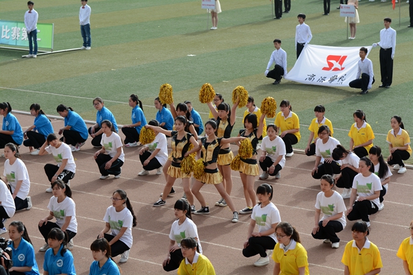 在欢快的运动会进行曲中,各院和教职工代表等方队精神饱满,依次入场。他们昂首阔步,精神抖擞,整齐的阵容,嘹亮的口号,飒爽的英姿,展示了当代师生意气风发、朝气蓬勃的青春风采,博得了全场的阵阵掌声。语言文化传播学院摆出了汉字“文”的队形,生物医药与食品工程学院用双手组成“海鸥”图形,城乡规划与建筑工程学院用五彩扇子组成“JGXY(建工学院)”、笑脸、“Go”三个图案,其他各院也纷纷以多种多样的形式展示了昂扬的精神风貌。