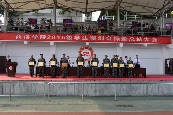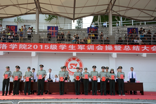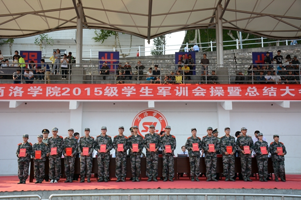 校武装部部长、军训团政委石启英宣读了2015级军训工作先进集体及个人的表彰决定。主席台上的领导和嘉宾为军训队列先进集体、军训内务先进集体、军训工作优秀教官、军训工作先进个人及军训优胜标兵代表颁发了奖牌和证书。