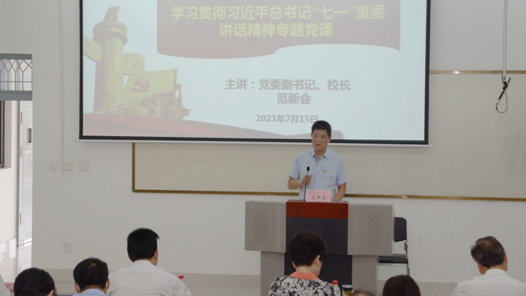 范新会与大家分享了自己学习习近平总书记“七一”重要讲话的体会和感悟,从“全面把握习近平总书记“七一”重要讲话的丰富内涵,深入学习习近平总书记“七一”重要讲话提出的新思想、新观点、新要求,结合学校实际学习好、贯彻好习近平总书记“七一”重要讲话精神”三个方面,系统分析了习近平总书记“七一”重要讲话的整体伟略和框架结构,深刻阐述了习近平总书记“七一”重要讲话的重大意义、主要内容和丰富内涵,重点解读了如何学习领会全面建成小康社会的历史性成就,实现中华民族伟大复兴这一贯穿中国共产党百年奋斗的主题,中国共产党百年来创造的“四个伟大成就”和向世界作出的“四个庄严宣告”,伟大建党精神和“九个必须”的宝贵经验。同时围绕讲话中提出的一系列新思想新观点新要求进行了系统讲解。