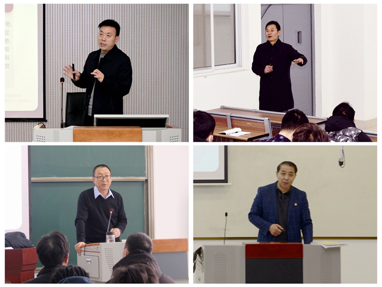 (左到右依次为党委副书记彭虎军、刘勇,副校长刘宝盈、王新军宣讲)