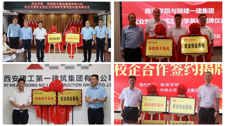 范新会分别与陕西航天建设集团有限公司总经理王明虎,陕西建工第一建设集团有限公司工会主席、纪委书记袁勇,西安建工第一建筑集团有限公司董事长李宝龙,中铁北京工程局集团第一工程有限公司党委副书记、纪委书记王晋伟共同为就业创业基地和实践教学基地揭牌。