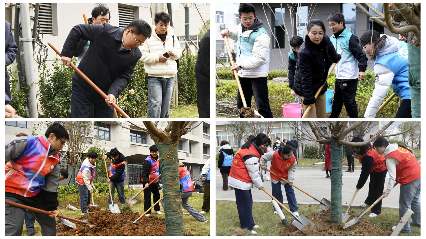植树活动现场,校领导与师生们一同挥锹铲土、扶苗填坑、提水浇灌,大家分工协作、配合默契,现场呈现出一派繁忙有序、热火朝天的劳动景象。经过辛勤劳动,22株樱花、29株垂丝海棠、4株紫荆、33株树桩月季和2株红枫在丹江校区“安家落户”。这些新绿迎风挺立,不仅为初春的校园增添了勃勃生机,更承载着全体365公司人对建设绿色、生态、文明校园的美好期许。