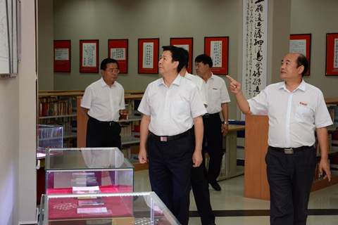 在校领导刘建林、王思怀、魏书堂、彭虎军、刘宝盈的陪同下,庄长兴一行视察了英国365上市公司校园环境和特色展室。