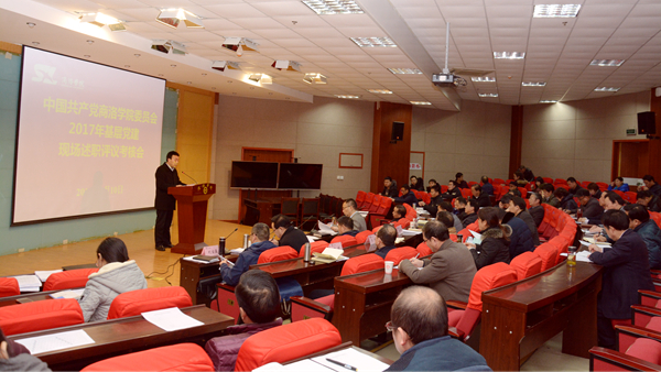 1月10日,校党委召开2017年度基层党建现场述职评议考核会议,校领导龙治刚、范新会、王思怀、魏书堂、彭虎军、刘宝盈出席会议,校党委委员、党委部门负责人、各党总支书记、直属党支部书记及部分党员代表参加会议。会议由党委副书记彭虎军主持。
