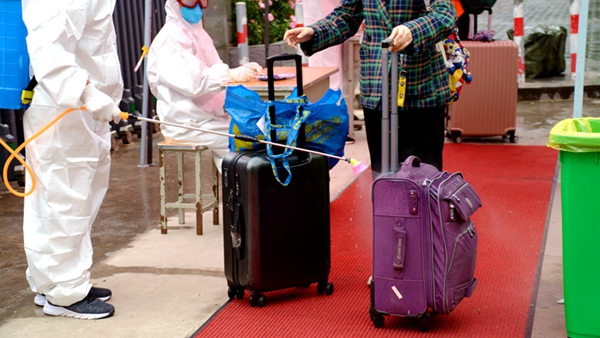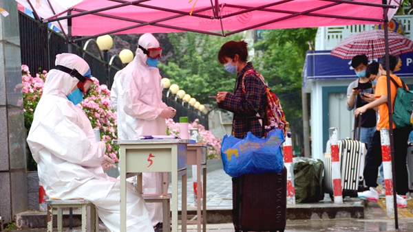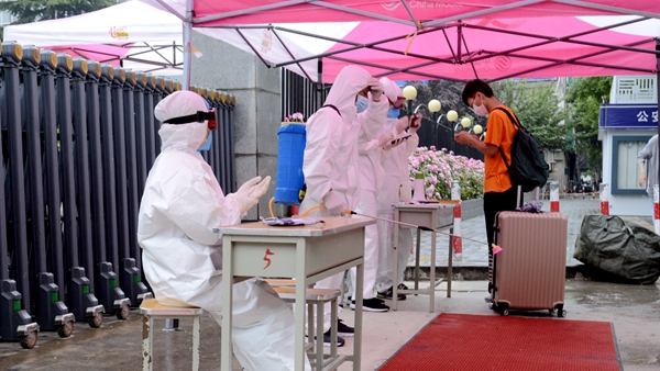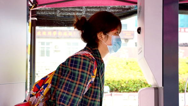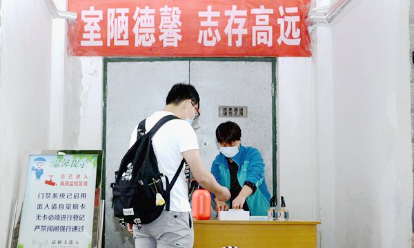 校门口,工作人员引导报到学生有序通过测温通道、消杀区、身份核验区、扫码报到区、院系学生报到处,对学生行李就地进行全面消毒、更换口罩、测量体温、核验健康绿码和身份证明、签订返校承诺书,依次完成开学报到各个项目步骤后,学生在辅导员、联络教师的陪同下,保持安全距离,前往各自所在的公寓楼,经公寓管理人员测温、手部消毒、信息登记后,领取出入证进入宿舍。