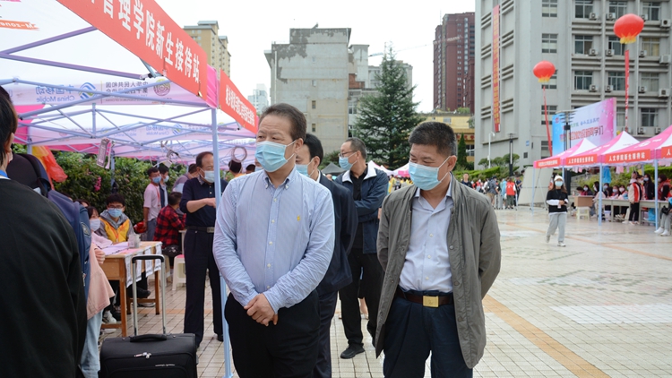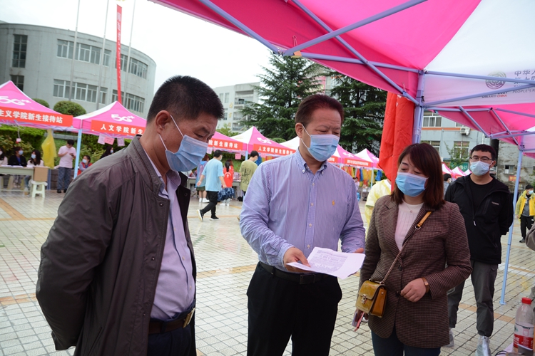 在党委办公室·院长办公室、学工部、教务处相关负责人的陪同下,张志昌、范新会一行来到各二级学院新生接待站,详细了解新生报到情况,对工作人员和学生志愿者饱满的精神状态和热情周到的服务给予充分肯定。校领导们还与现场报到的新生及家长亲切交谈,询问他们对迎新工作的意见建议,叮嘱新生要尽快适应大学生活,积极做好职业规划,精进学业,增长才干,砥砺奋进,实现梦想。