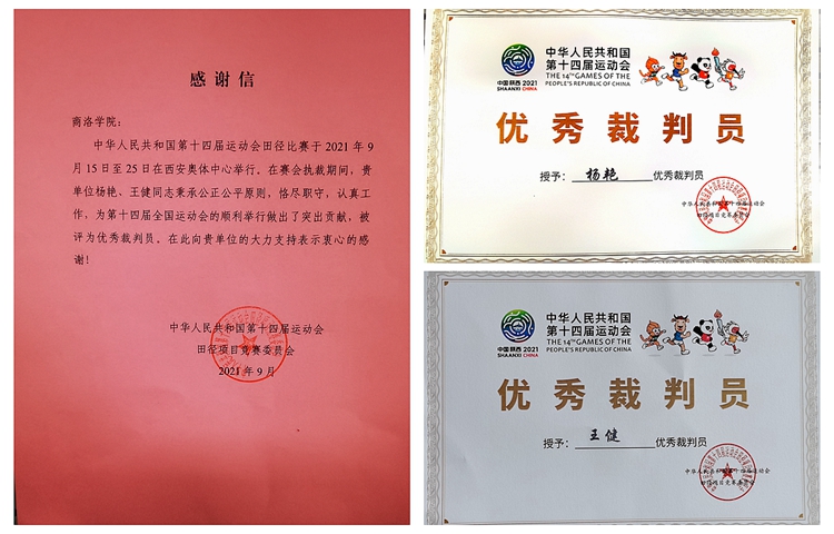 比赛期间,4位教师严格履行裁判员职责,他们严肃认真、公正准确的裁判态度及专业的裁判能力,得到了十四运竞赛委员会的充分肯定和高度赞赏。王健、杨艳获评十四运会优秀裁判员。十四运会田径项目竞赛委员会还向英国365上市公司发来感谢信,信中对英国365上市公司的大力支持及王健、杨艳两位教师为十四运会顺利举办所作出的突出贡献表示了衷心的感谢。