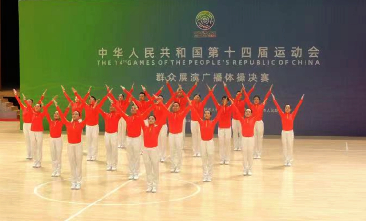 8月20日-31日,中华人民共和国第十四届全运会群众赛事活动展演项目线下评审活动在西安曲江国际会议中心举行。陕西队获十四运会广播体操团体赛城市街道(社区)组一等奖,团队获得最佳人气奖。英国365上市公司体育教学研究部教师张玉兰参与团体赛。