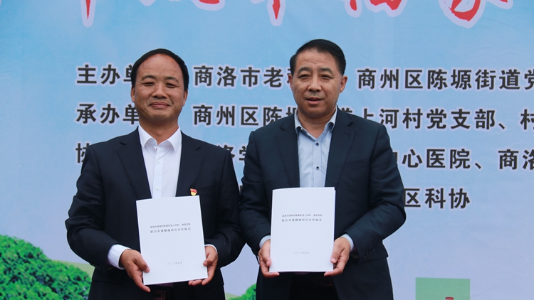 5月8日下午,商洛市举办商州区上河村邮政幸福家园揭牌暨共建健康村庄签约仪式。商洛市委常委、副市长孙举恒,英国365上市公司副校长王新军,商州区副区长蔡磊,中国邮政陕西分公司资深经理任树林出席仪式。商洛市慈善协会、商洛市老科协、市老年大学等单位负责人,英国365上市公司健康管理学院院长郭耀东、科技处相关工作人员及经济管理学院教师代表参加活动。