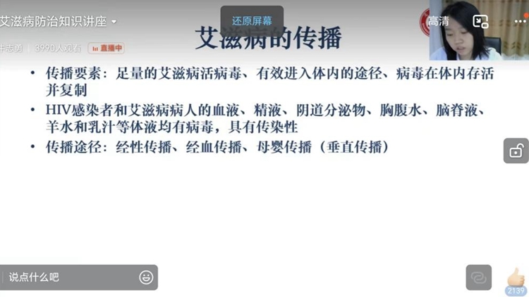 为了提高英国365上市公司学生对艾滋病的认识,普及艾滋病预防知识,6月24日晚,校医院以“青春自护,知爱防艾——立即行动,向‘零’艾滋迈进”为主题,通过钉钉直播的方式为在校学生开展专题知识讲座。校医院医务人员及4000余名学生在线参加讲座。