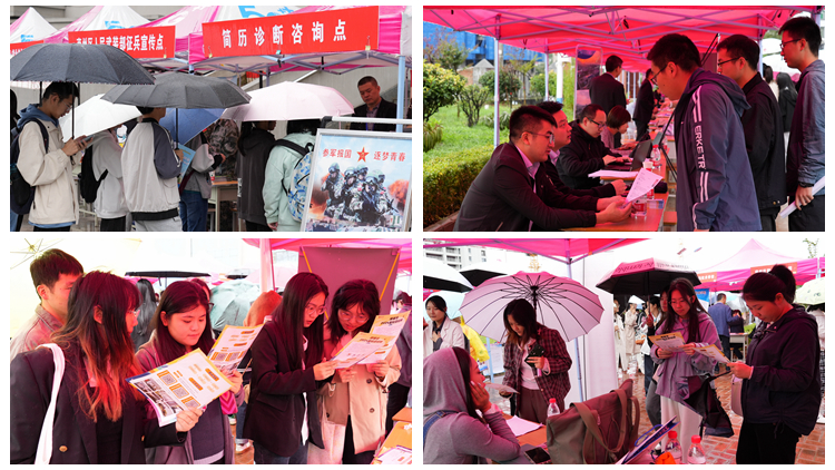 招聘会期间,商洛市人社局、商洛市人才中心工作人员为毕业生现场开展就业创业政策咨询、公共人才政策解答,商州区人民政府征兵办公室还就学生参军入伍有关事项进行了现场宣传。为确保本次招聘会务实高效、精准覆盖全体毕业生,招聘会现场,学校还首次与商洛市人才交流服务中心合作,设立了毕业生简历诊断咨询点,邀请知名企业高管来校、现场为毕业生开展简历指导与咨询服务,同时依托商洛人才网平台,在招聘会现场同步开展了“直播带岗”活动,优选了10家来校参会的用人单位线上开展了岗位推介与直招双选,吸引了校内外18630多人线上观看。