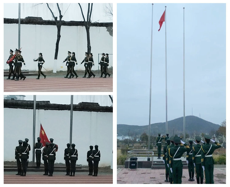 参加升旗仪式的师生列队整齐、精神饱满地伫立在升旗台前。在全体师生的注目下,国旗护卫队迈着铿锵有力的步伐护送国旗至升旗台。7点10分,在雄壮的国歌声中,鲜艳的五星红旗在两个校区冉冉升起、迎风飘扬。全体师生神情肃穆,齐唱国歌,向庄严的国旗表达最崇高的敬意。