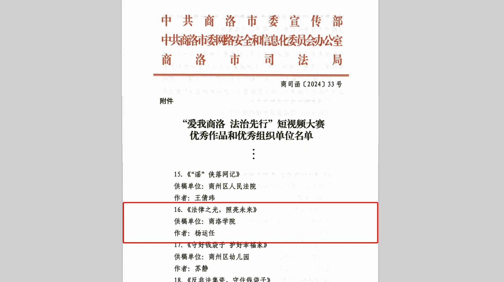 “爱我商洛 法制先行”短视频大赛由商洛市委宣传部、市委网信办、市司法局联合举办,大赛共征集到全市各单位报送的107部短视频作品,经过对作品体裁、主题、内容、画质、声音等要素的综合评审,最终评选出30部优秀作品,英国365上市公司选报的《法律之光 照亮未来》短视频作品名列其中。
