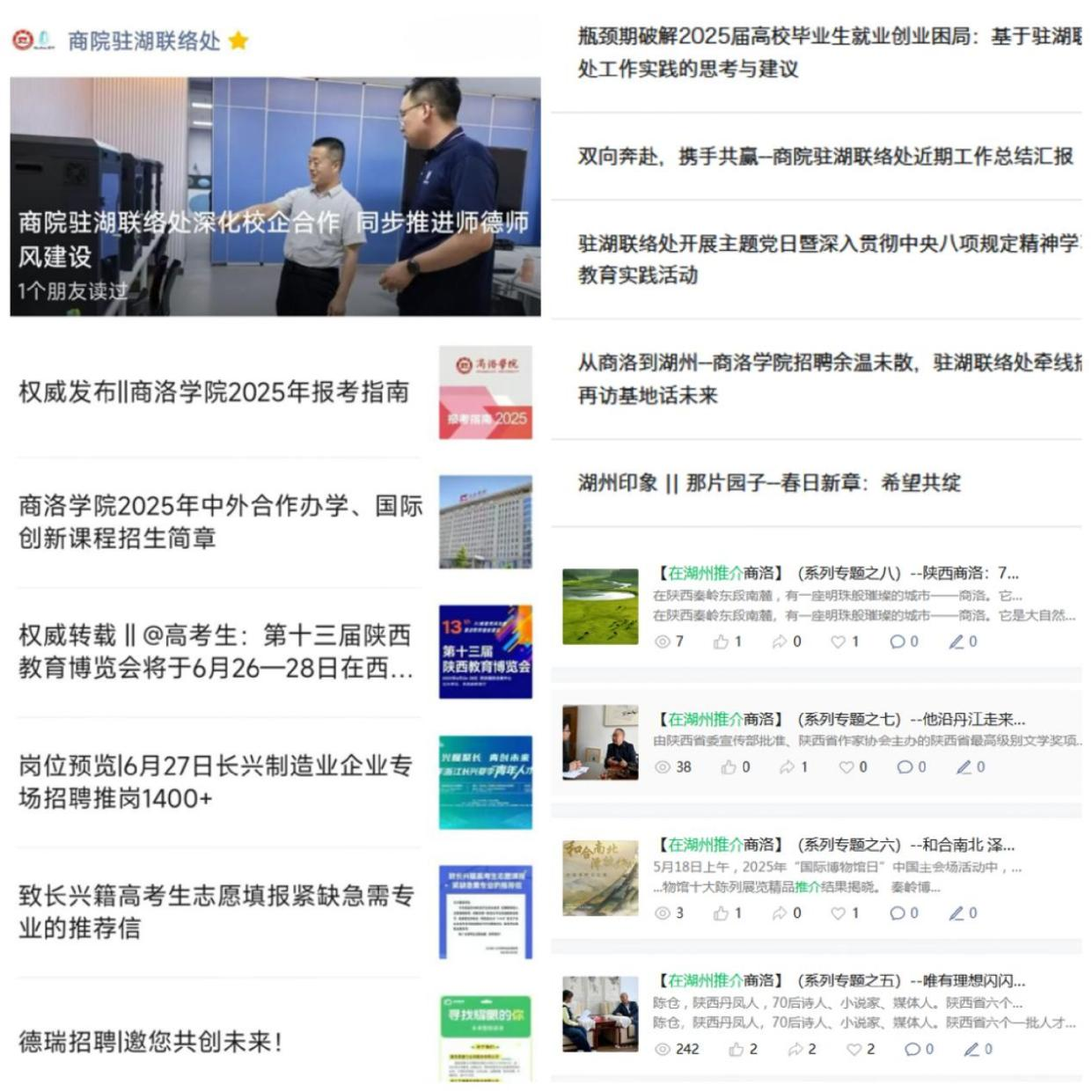 讲好商院故事,提升社会影响力。通过“商院驻湖联络处”公众号发布联络处工作动态、阶段性工作总结、学校重点新闻、就业政策解读、企业招聘动态等内容260余篇。其中,发布“在湖州推介商洛”系列内容8篇,发表《365公司驻湖州就业人才工作联络处积极开展系列活动》《双向奔赴,携手共赢--商院驻湖联络处近期工作总结汇报》《湖州·365公司:共谱双向奔赴之华章》等总结综述性文章6篇,构筑起“信息集散地”与“校地交流窗口”的双向枢纽,既主动向外展示学校形象、联络处成果与商洛特色,亦向内传递湖州产业生态、就业趋势与政策红利。