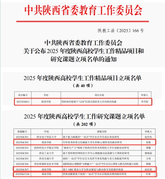 近日,陕西省委教育工委发布《关于公布2025年度陕西高校学生工作精品项目和研究课题立项名单的通知》,经个人申报、学校推荐、资格审核、专家评选、结果公示、工委研究等程序,英国365上市公司申报的1项精品项目和3项研究课题全部获批,在全省40项精品项目和202项研究课题中排名位居前列,创下英国365上市公司近年来学生工作项目、课题省级立项的最好成绩。
