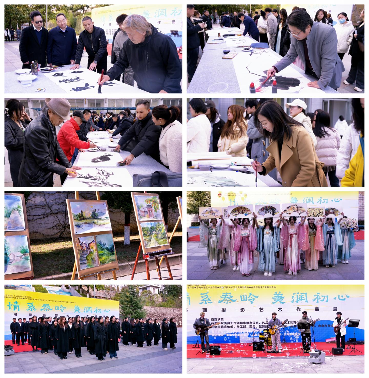 本次活动通过艺术作品展览、现场创作与文艺节目表演相结合的形式展开。在大学生美育合唱团深情演唱《南山南》和美育非遗社团表演的《书简舞》中,整场活动正式拉开帷幕。在“情系秦岭”书画笔会环节,校内外书画名家与师生代表在民乐伴奏下即兴挥毫,现场创作的作品笔墨酣畅,引来阵阵赞叹。同步进行的“秦岭记忆”百人百米长卷共创活动将气氛推向高潮,嘉宾与师生们纷纷提笔,在百米长卷上共同描绘心中的秦岭山水、风物人情。活动现场还安排了艺术家交流互动与文创赠品环节,有效促进了艺术经验的分享传承,营造了浓郁的校园文化艺术氛围。