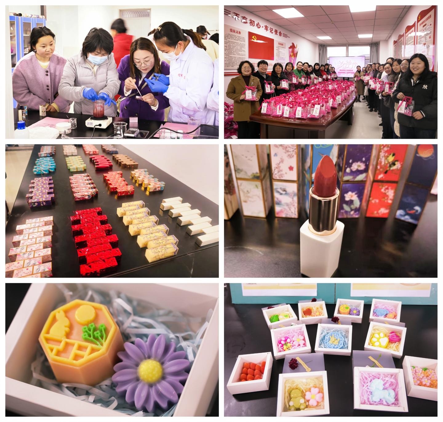 活动设置口红唇膏与手工香皂两大制作体验专区,配备专业指导教师进行全程讲解与操作演示。参与人员按照操作指引,依次完成混合、加热、灌装、定型等工序,亲手制作专属节日纪念礼品。现场气氛热烈、互动踊跃,大家围绕制作技巧与创意构思深入交流,在协作共创中感受手工艺术的独特魅力,欢声笑语不断。