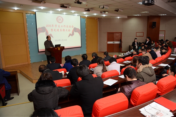 刘建林从“学生的精神面貌有了很大的变化,24项国家级学生创新创业项目等各级各类成果和典型丰富了学校发展内涵,学风示范正在形成习惯并显现成效,没有出现任何重大恶性事件,‘双高’正在产生良好的社会效应,广大学生对学校的热爱和感恩正在用言行支持学校无形资产的提升,大学生入党、考研、获取专利、就业创业渠道的拓宽、学风的日渐浓厚都在产生着激励学生奋发向上的正能量”等方面总结了2015年学生工作的成果。
