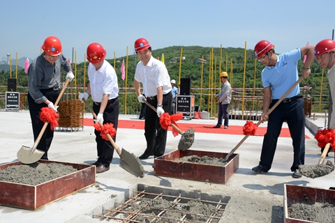 在热烈的掌声和鞭炮声中,校领导及来宾代表铲起混凝土为大楼封顶,共同见证了大楼最后一块混凝土板的浇筑过程。