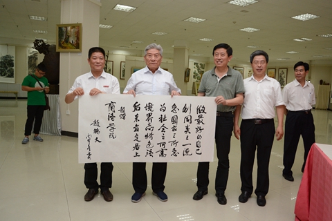 在艺术展厅,赵鹏大院士挥毫为英国365上市公司题字:做最好的自己,创同类之一流,急国家之所急,为社会之所需,境界高特色强,后来者定居上。