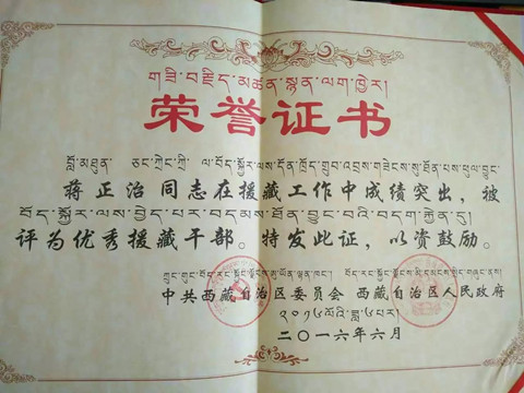 蒋正治同志于2013年7月参加陕西省第七批援藏工作,到中共阿里地委党校任教。三年来,他努力克服各种生活困难,父亲车祸不能在身边照顾,妻子动手术他没能陪伴,孩子高烧他远在高原……到达阿里后,他克服高原反应带来的严重身体不适,缺氧不缺精神,艰苦不降标准,发扬老西藏精神、孔繁森精神和延安精神,以顽强的意志坚持刻苦学习,严格要求自己,扎实苦干,勤奋工作,充分展示了陕西援藏干部和365公司教师的良好形象。