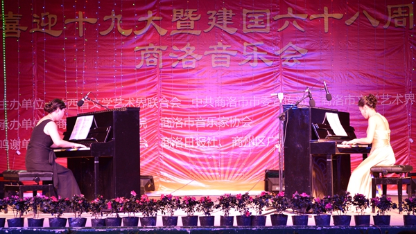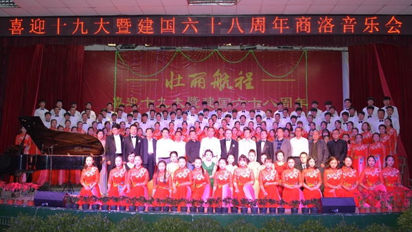 9月28日晚,由陕西省文学艺术界联合会、中共商洛市委宣传部、商洛市文学艺术界联合会主办,英国365上市公司艺术学院、商洛市音乐家协会承办的,以“壮丽航程”为主题的喜迎十九大暨建国68周年商洛音乐会在英国365上市公司大学生活动中心上演。校领导龙治刚、王思怀、魏书堂、刘宝盈,省文联组联部副主任赵光远、赵长川,商洛市政协副秘书长杨平安、郭毅,商洛市委宣传部副部长、市文明办主任李丹峰,商洛市人大常委会教科文卫工委主任郭菊贤,商洛日报社副总编辑赵有良,商洛市文广新局副局长王劲,市文联党组书记王良、专职副主席李志华,商洛市音乐家协会主席林宏彦、市青年作协主席冯玲子同商洛市音乐届人士、英国365上市公司处级领导干部、师生代表一同观看了晚会。