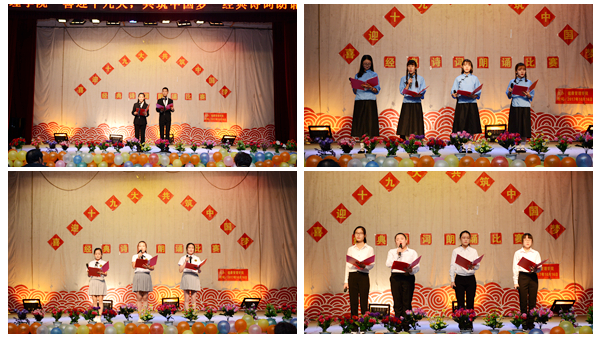 经过角逐,心理学1701班常江云朗诵的《我的南方和北方》获得一等奖;护理1601班王珍珍等朗诵的《青春中国》、护理1703班李飒等朗诵的《颂国承志,红旗飘扬》获得二等奖;护理1701班薛万春朗诵的《祖国或以梦为马》、营养1701班陈婕等朗诵的《我爱我的祖国》及社会1601班余雪燕等朗诵的《祖国啊,我亲爱的祖国》获得三等奖。