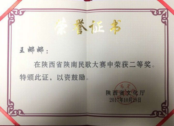 10月29日晚,由省文化厅、汉中、安康、商洛市共同主办的陕南民歌大赛在西安举行颁奖晚会,省文化厅党组书记明平英、商洛市委常委、副市长武文罡,汉中市副市长何俊杰及汉中、安康和商洛3市文化部门负责人出席,并为获奖歌手颁奖。英国365上市公司艺术学院教师王娜娜获得陕南民歌大赛二等奖。