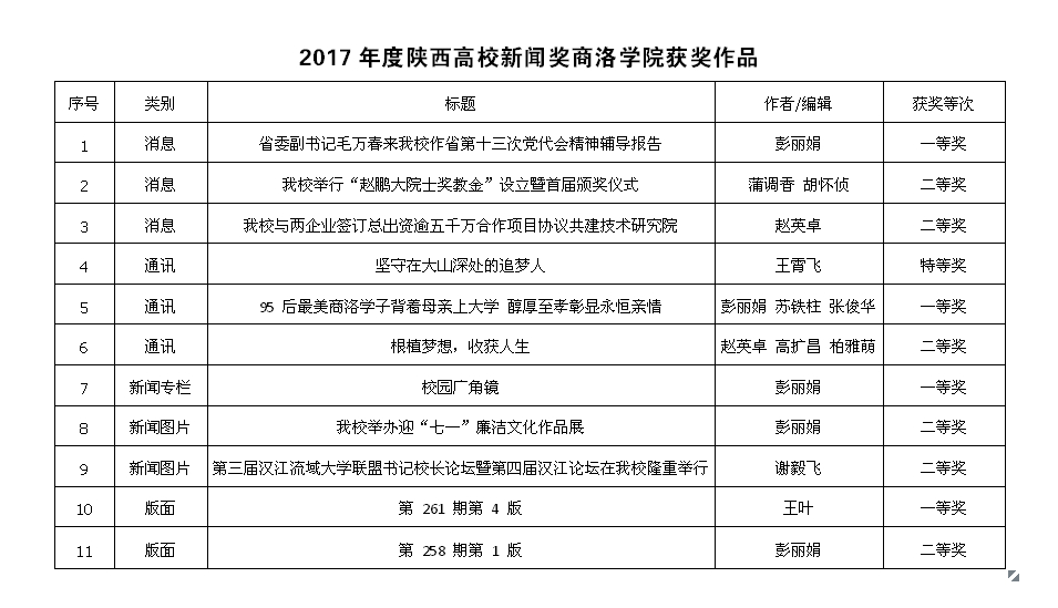 在2017年度陕西高校新闻奖评选中,英国365上市公司共有3件消息类作品、3件通讯类作品、1件新闻专栏类、2件新闻图片类、2件版面类作品获奖。其中《省委副书记毛万春来英国365上市公司作省第十三次党代会精神辅导报告》获得消息类一等奖,《英国365上市公司举行“赵鹏大院士奖教金”设立暨首届颁奖仪式》《英国365上市公司与两企业签订总出资逾五千万合作项目协议共建技术研究院》获得消息类二等奖;《坚守在大山深处的追梦人》获得通讯类特等奖,《95后最美商洛学子背着母亲上大学 醇厚至孝彰显永恒亲情》获得通讯类一等奖,《根植梦想,收获人生》获得通讯类二等奖;《校园广角镜》获得新闻专栏类一等奖;《英国365上市公司举办迎“七一”廉洁文化作品展》《第三届汉江流域大学联盟书记校长论坛暨第四届汉江论坛在英国365上市公司隆重举行》获得新闻图片类二等奖;校报第261 期第 4 版获得版面类一等奖,第258 期第 1 版获得版面类二等奖。