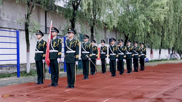 “升国旗,奏唱国歌,行注目礼!”随着主持人的口令,雄壮的《义勇军进行曲》奏响。旗手振臂一挥将国旗展向空中,鲜艳的五星红旗在国旗护卫队员庄严军礼的映衬下,迎着徐徐的微风冉冉升起,飘扬在校园上空,为雨后的校园增添了一抹庄严的色彩。
