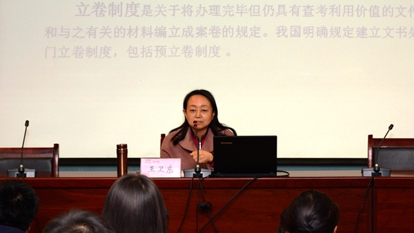王卫东以《文件材料的立卷归档及其方法》为题,结合自身档案工作经历,全面系统地为英国365上市公司档案工作人员阐释了立卷归档工作的重要性及文书立卷人员职责,详细介绍了立卷归档工作的方法、流程和操作实务。她还现场为英国365上市公司档案管理工作人员答疑解惑,把长安大学的档案管理理念和她个人的工作经验分享给与会人员。她的报告通俗易懂、生动具体,为英国365上市公司科学规范地做好档案材料收集、立卷、分类、组卷、编目、移交归档等具体工作提供了有益指导。