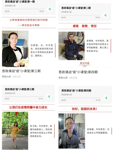 为贯彻落实习近平总书记关于新冠肺炎疫情防控工作的重要讲话和指示精神,全力支持配合打赢疫情防控战、总体战、阻击战,按照教育部党组“停课不停教、停课不停学”的要求,积极响应教育部举办的高校“思政课战役小课堂”专项活动,助力思政课线上教学,英国365上市公司马克思主义学院通过微信公众号开办了“思政课战疫小课堂”专题栏目,组织学院教师录制思政微课,通过文字、图片加音频的形式定期向学生推送,同时还通过学校官方微信公众号进行推送,以扩大学生覆盖面。目前,“思政课战役小课堂”已经发布7期内容,获得了师生广泛关注,进一步激发了师生从我做起、助力抗疫的积极性和自觉性,坚定了青年一代勇担时代使命的决心和信心。