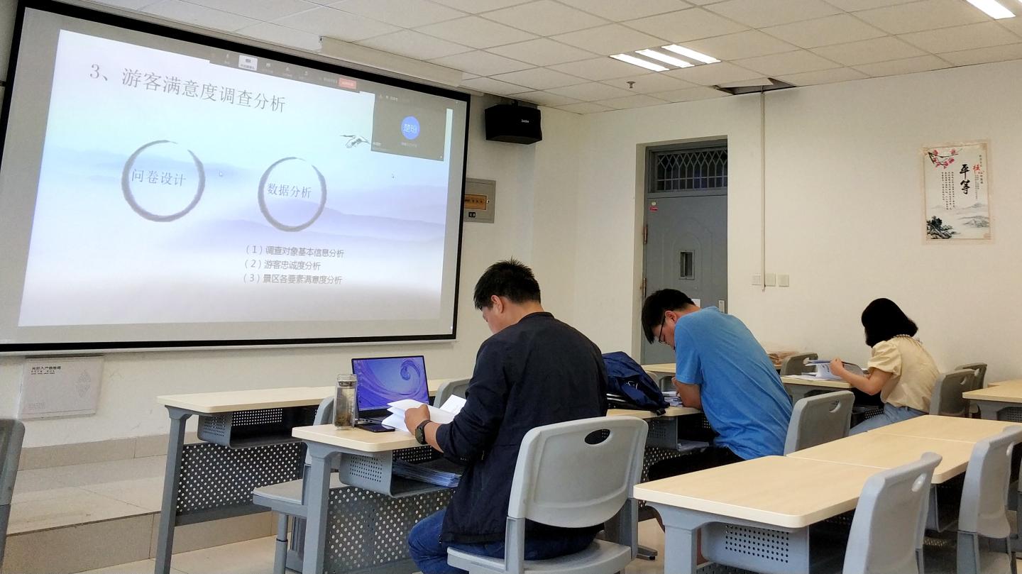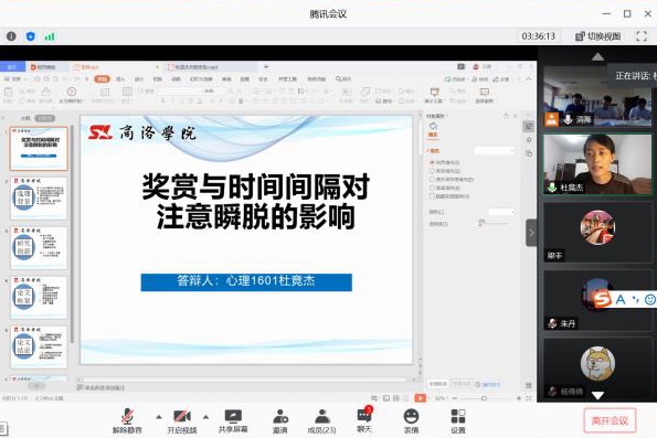 ——线上答辩、井然有序。各学院根据实际情况采取线下线上相结合的方式组织论文答辩。近2000名学生使用腾讯会议、腾讯课堂、钉钉等稳定、流畅的网络平台,通过在线直播互动或视频会议方式进行论文答辩。各学院根据本院师生的论文写作与指导进展情况,认真组织筹划,严守时间节点,科学制定本学院毕业论文(设计)答辩方案及成绩评定规范,提前做好在线答辩细节演练,分配好答辩小组,严密答辩流程,确保了答辩工作与往年现场答辩相比等质同效、水准不降。在线上答辩中,合理分配任务,做好排序通知,保持答辩顺畅进行。在线下现场答辩中,做好室内消杀、开窗通风,避免人员聚集,严格落实各项防控措施。