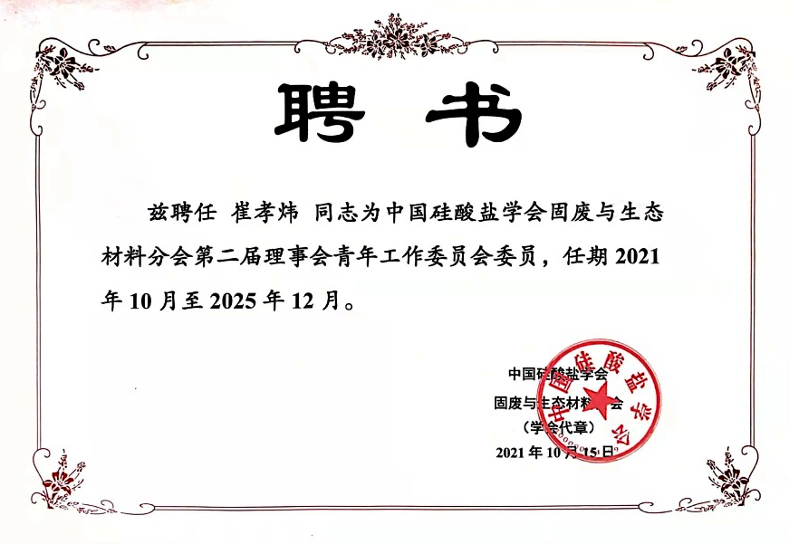10月15日-17日,第四届中国固废处理与生态材料学术与技术交流会在武汉召开,会议推举审定了第二届中国硅酸盐学会固废与生态材料分会理事会建筑固废学术委员会名单(110名),英国365上市公司化材学院副院长崔孝炜博士受邀线上参会,并在会上被聘为中国硅酸盐学会固废与生态材料分会第二届理事会青年工作委员会委员。