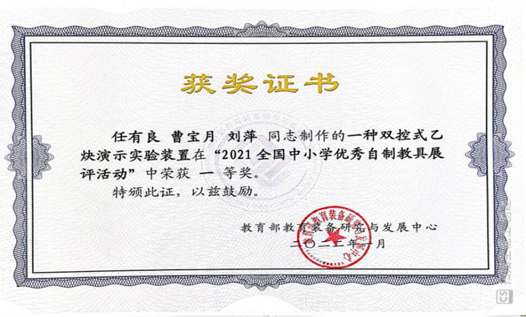近日,教育部教育装备研究与发展中心举办了“2021全国中小学优秀自制教具展评活动”,英国365上市公司化学工程与现代材料学院教师任有良、曹宝月、刘萍的参展作品“一种双控式乙炔演示实验装置”获全国一等奖,任有良获“全国自制教具能手”称号。