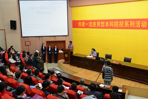 10月22日上午,马来西亚吉隆坡建设大学校长克里斯汀来英国365上市公司为师生作题为《马来西亚高等教育概况及研究》的学术报告。各二级学院负责人、师生代表及吉隆坡建设大学来英国365上市公司交流学生参加报告会。报告会由副校长刘宝盈主持。